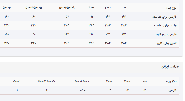 - هر 160 کاراکتر انگلیسی یا 70 کاراکتر فارسی (با در نظر گرفتن فاصله ها) یک پیامک در نظر گرفته خواهد شد.